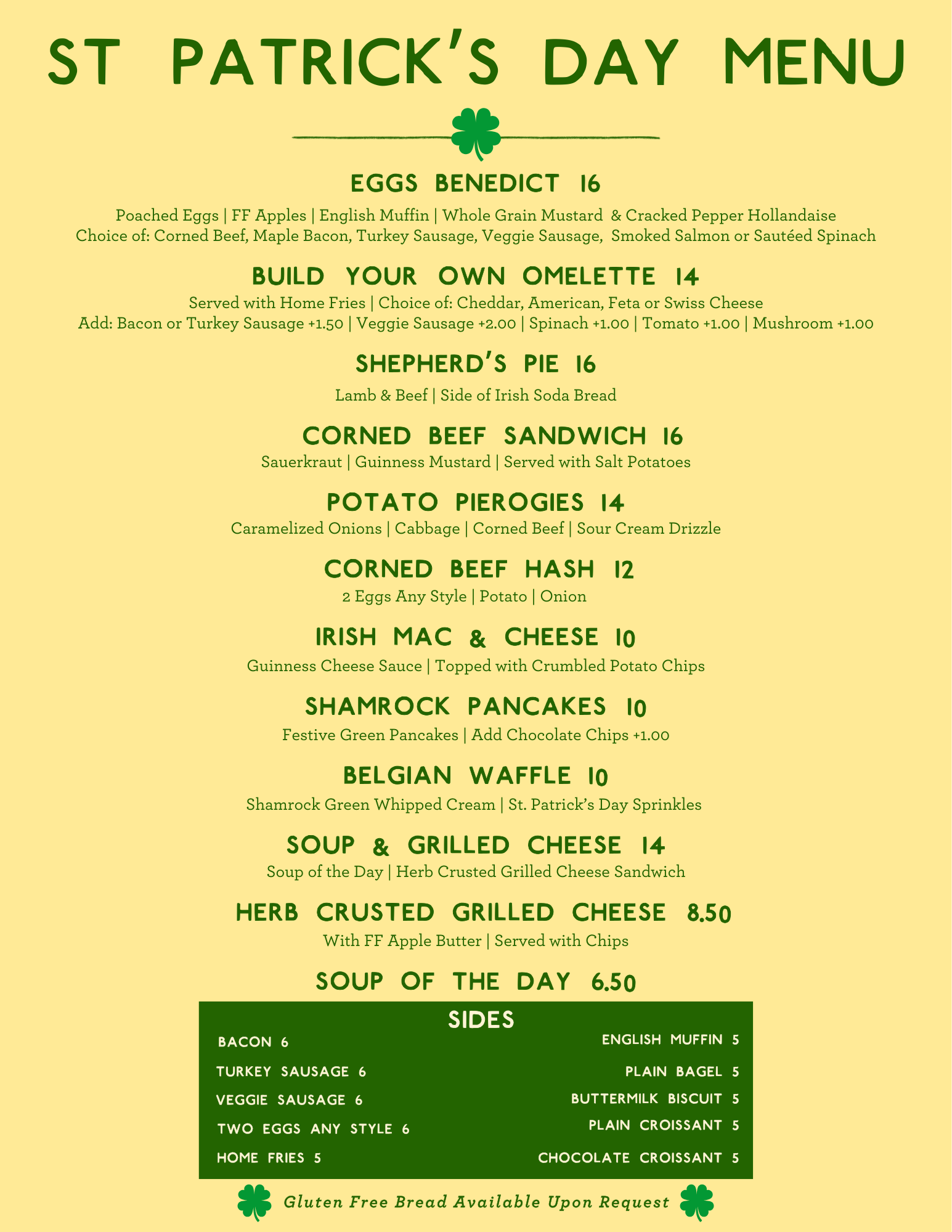 We’ll be serving a special St. Patrick’s Day Brunch Menu all weekend long, featuring hearty classics and festive specials. Think Shamrock Pancakes, Shepherd’s Pie, Corned Beef favorites, and rich Guinness-infused classics. Select regular brunch items will also be available (see full menu below).